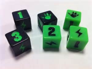 You’re goal in the game is to kill all the monsters or get 20 victory points. Everyone starts with 10 health and 0 victory points. On your turn, you will roll 6 dice, Yatzee style, to determine what your monster can do. Claw marks attack other monsters, hearts heal your monster, lightning bolts gain you energy and numbers will get you points.
