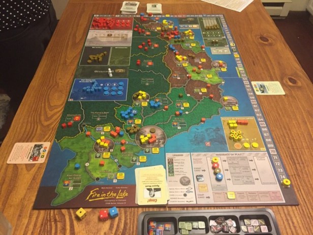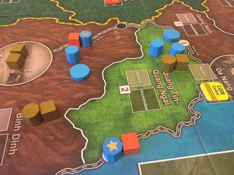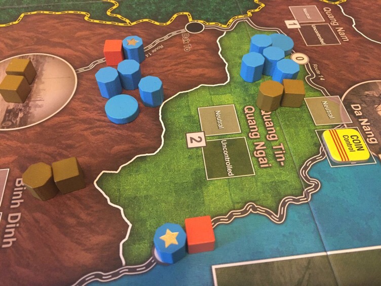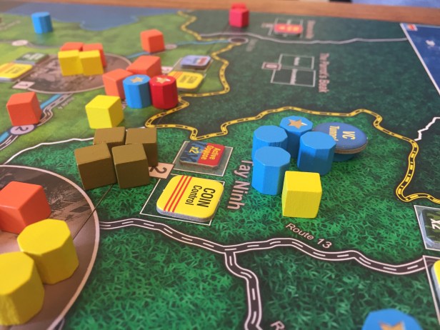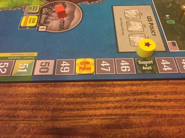 2. The US removed most of the VC bases (except for the tunneled base in Tay Ninh) early giving +6 Aid for each which was a boost in the middle game. The resources track was as high as 75 and Aid was over 55 for most of the game.