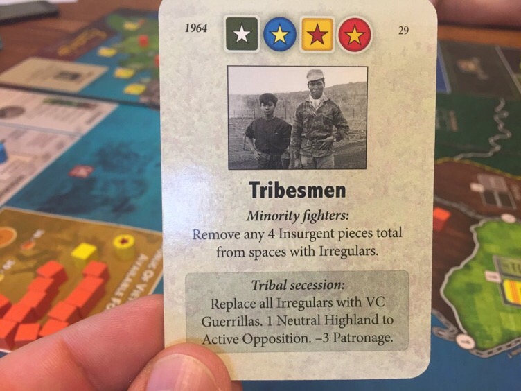 This event allowed me to remove 2 underground VC guerilla units in the highland province of Binh Dinh and the lowland province of Quang Tin. Usually, this action would have taken me several turns, one turn to Sweep into the area uncovering the guerilla units making them vulnerable to Assault and the next turn to carry out the Assault operation to remove the pieces. So this event was very powerful and allowed me to get done in 1 turn what would have taken me several rounds to accomplish. But to my great surprise and frustration (the frustration with this game is glorious!) the VC shrugged these losses off and kept coming back like fruitful cockroaches! They simply took their Rally operation and regained their dominance in that area.