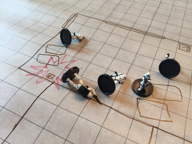 We rappelled into the mouth of the mine shaft with the Rebels intel that told them that Adros Vict, a Gotal spy, was being held there. Captain Carren Talon was the leader of the small Rebel strike force, consisting of new rookie (“shinies”) commandos. We descended into the prison using a large lift that was designed to carry large equipment and heavy loads so it moved very slowly. As we descended, we took fire from Storm Troopers who were set as guards at the bottom of the shaft. With some deft shooting from Tekk, who blasted the lifts control box causing an explosion which destroyed the shipping crates and took out 2 of the Stormtroopers, we dispatched the guards and began the assault on the prison cell block where the target was located.