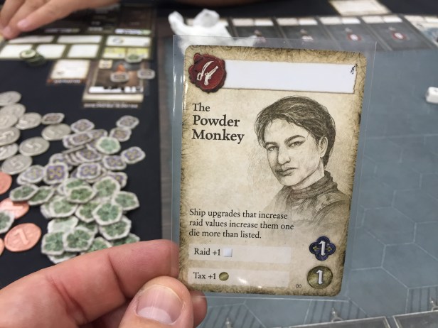 We first were able to get into character and add some customization to the game. I really like the element of being able to name the characters, ships, islands and even your nation. I named my character Jean Baptiste and my country Aquilonia. I was also able to name my two ships, one being The Black Swan and the other The Crescent Moon. This level of customization is very attractive to me when I play these Legacy style games because it adds to the narrative of the game which I enjoy significantly. Each player received a paper player board that can be modified by naming the ships or obtaining upgrades, taking damage or constructing buildings that provide advantages.