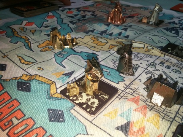 Like so many area control games it seemed most beneficial to go last in a round. All of the actions focus on gaining gold. Placing temples allows you to control the town, meaning the people of that town are now worshiping you. Razing a town only gives you one gold but could be a good way to get rid of a town your enemies control.