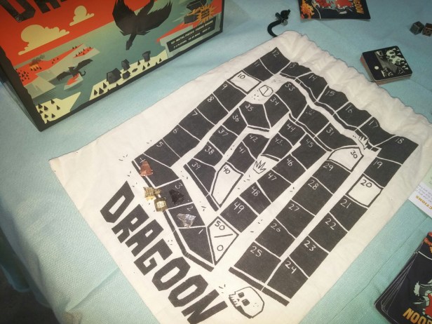 This was a very interesting game that was simplistic yet confusing. First off, the components were on the far end of the spectrum. The bits were stellar. Your dragon, buildings, caves, scoring markers were all made of heavy metal and colored beautifully. The game just looked gorgeous on the table…..but then comes the boards. The main and scoring boards were made of cloth.