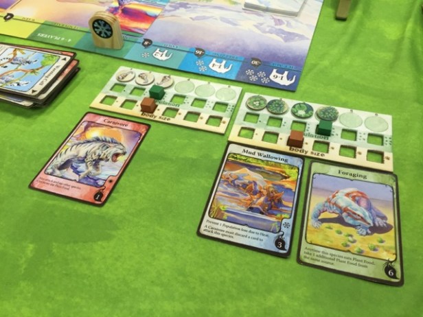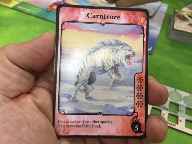 This mechanism adds a completely new strategy twist to the game. Not only do you have to worry about how much food to put out but the card you want to put out might have more snowflakes and you may want it to get warmer. Or maybe it is more important for you to add snowflakes instead of putting out more food. What if you are a carnivore and you want to starve out the herbivores but you don’t want it to get colder…but the cards you have don’t fit that situation. This game adds the need for even more adaptability to an already heavy strategy game.