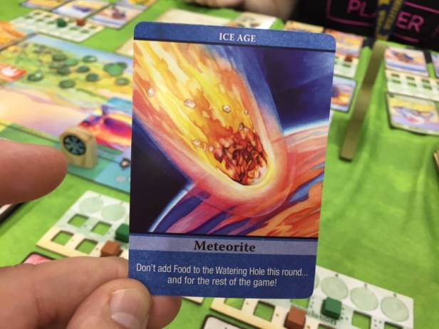 The thing that Climate adds to the game is the all changing weather and atmosphere cards. The biggest change comes in the form of the cards. Now on every card there are symbols on the left had side of some of the cards. There are suns for warmth and snowflakes for cold. Once you reveal the food cards for the round not only do you add food to the watering hole but you also move the weather with it. If the cards have more suns on them, the weather gets warmer. If there are more snowflakes, it gets colder. Depending on how hot or cold it gets, the climate might be killing off some of the population of your species. There are also two different events that are laid out onto the climate board, one on the warm side and one on the cold. Each side of the climate spectrum has three different zones. These will only trigger if the current weather reaches each of these events. If it does go off, you draw the next event card and put it on the board in the appropriate spot. They have added more trait cards to make your decision of going defensive against predators or protection against the elements more meaningful.
