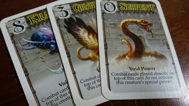 The strategy is top notch in this game. I feel like every choice I make is going to determine whether a Colossal is going to live or die. There is a ton of “take that” elements in this game but they are fantastic the deeper the game goes…..there might be 4 different players that are betting on the same Colossal and no one wants to destroy it, but if you don’t some one is going to get more points for who bet on it first. There is a bit of randomness in the game when it comes to what cards you are dealt on each turn. I think that is part of the fun also, hoping you can get cards to help your cause. Even though that was the randomness, I almost always felt that my cards could help me or hurt others….which is good.