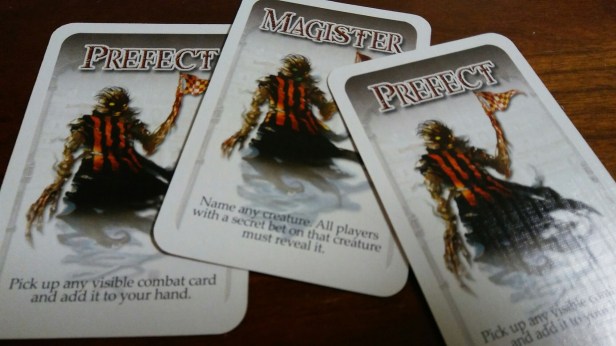 At the beginning of the game there are 8 Colossals put in a row that will be in the fight. Each of these has a special ability to them. There are 12 Colossals in all, so each game will have a different set up. Each Colossal has cards associated with them with a power rating from 0-10. All of these cards are shuffled together along with two other types of cards, Spectators and Referees. Each player starts with 5 betting chips and 8 cards. The game is ready to be played.