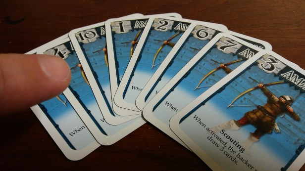 When you play a card you simply take a card from your had that matches one of the Colossals that are still alive and place it uner that Colossal. The card you play will determine that Colossal’s strength for that round. If there is already a card under the Colossal you simply cover that one up with the one you play.