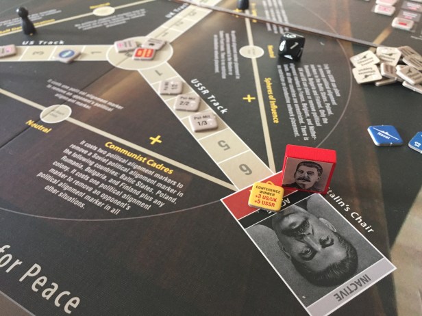 During our conference in late 1944, Stalin (played by me) focused on winning all three of the Pol-Mil issues on the table. This provided the Russians with 4 Political Markers and 8 Clandestine Markers and allowed for a significant increase in their influence in the Eastern Bloc countries.