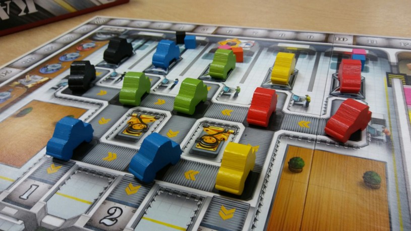 This game by Vital Lacerda is chocked full of mini games. It seems like every action area has a mini game to it. The most notable and my favorites are the Parts Department and the Assembly Line. In Kanban, you are trying to develop different styles of cars with upgrades. The first area is where you choose designs. Then you need to go to the Parts Department to order parts for your cars. You do this by placing a parts card on the corresponding area. The trick is you have to split the card up into two different sides. Four parts will go on one side and two on the other. The only parts that are added are the colors that match on the same side. It is a nice puzzle that makes you stop and think for a minute. And wouldn’t you know it…..you never get a card that gets you all the parts you need. The next mini game is the Assembly Line. This is where you order cars to be assembled and brought out to the test track. There are 5 different color cars that you can assemble but make sure you have a part to put on those cars. You choose which color you want to produce and then you slide it down the assembly line forcing other cars to move out. This is key to maximizing your points….you want to get cars that you have designs for and then put them in your garage. I really love all the mini games in Kanban. The game is actually quicker than you think and every time you play you think about how you can do it better than the last time.