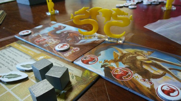 While playing Simurgh, I was using my Dragon Riders to go about the wilds to complete objectives, travel on exploration tiles, and gather resources. In this particular game, I had a couple of Dragons to use their special abilities at optimal points in the game. If you haven’t heard of or played Simurgh than I suggest you give it a try. It is a very nice medium level worker placement game set in a very cool universe with Spearmen and Dragon Riders. The game has a couple unique mechanisms that make it stand out from the rest. Multiple end game conditions adds a nice balance and adds replayability. The decision about adding tiles to the wilds where other players may benefit from them as well, adds some good interaction and makes for some very agonizing decisions. I have yet to win this game but I really like playing it.