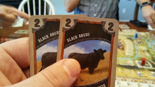 Great Western Trail is all about herding and selling cattle in the Ol’ West. Players will collect cattle and either “sell” them to different buildings on their way to Kansas City or “sell” them to various cities located along the railroad once they get to Kansas City. When you get to Kansas City you need variety, different heifers only count as the points on the card. In the game we played, I managed to get me a couple Black Angus and sold them to a building on the trails. It was a good way for me to get some quick cash since the pair would not be optimal at Kansas City. There are tons of decisions to make in this design by one of my up and coming favorite designers, Alexander Pfister. Stronghold games has a great game here that makes buying and selling cattle way more fun than it should be.