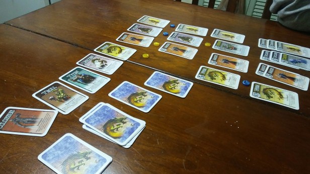 Colossal Arena came as a surprise to me and my gaming group. This bidding game from Fantasy Flight is pretty simple at it’s heart yet plays out very fun and strategic. There is a bit of random card draw but it still provides a lot of choices. We started our game with 8 colossi, like you do every time. Each round a colossal will be eliminated. In order to win the game you need to bid early and often and hope the colossal that you put money down on finishes the fight. In this particular game I put my secret bet on Cyclops. My wife went with Unicorn. She lost her secret bet but still managed to stay within two points. I won 11 to 9. I love how tight the points are in this game and afterward you can pin point a specific thing you did that kept you from winning or helped you to win. The secret bet is worth the most points but you don’t want to tip your hat at who you wanted to win. This quick, smooth yet thinky little bidding game by Reiner Knizia was a huge success with my wife and my gaming group.