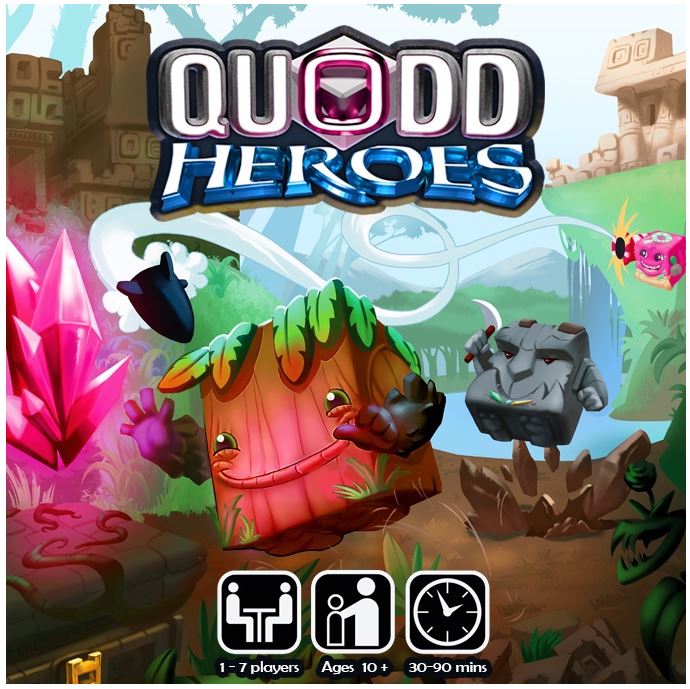 The first thing that caught my eye about Quodd Heroes are the miniatures! They are so unique and cool looking. Not only are they awesome to look at but they are the main mechanism in the game. They are cube shaped because that is how they move. On your turn you are going to move your Hero, to do this you “roll” them to one side forward, backward, left or right. After you move them, you then activate the ability associated to the side that is up. It could be another move action or a fight action or something else. This is designed as a cooperative game but stretch goals have unlocked a 1 vs. all mechanic. Not only that, but it can play up to 7 players. It comes with many scenarios but they also say that you can make up your own, playing tag, capture the flag football??? I am looking forward to seeing what other players come up with on the forums that I could try out! Man, those miniatures are so cool!!