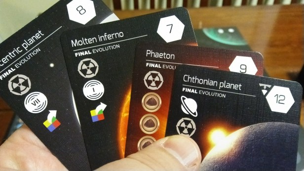 This is my biggest issue with the game. There is a lot of randomness and luck involved. There are very few things that you have actual control over. Since everyone can move any planet and play any card on a planet changing where it is and what type of planet it is, the Final Evolution cards just seem to be pure luck. You just hope you have a planet that you can use for any of your Final Evolution cards. It just seems the best strategy is to get as many Low and High Evolution cards out as possible and see where that leads you.