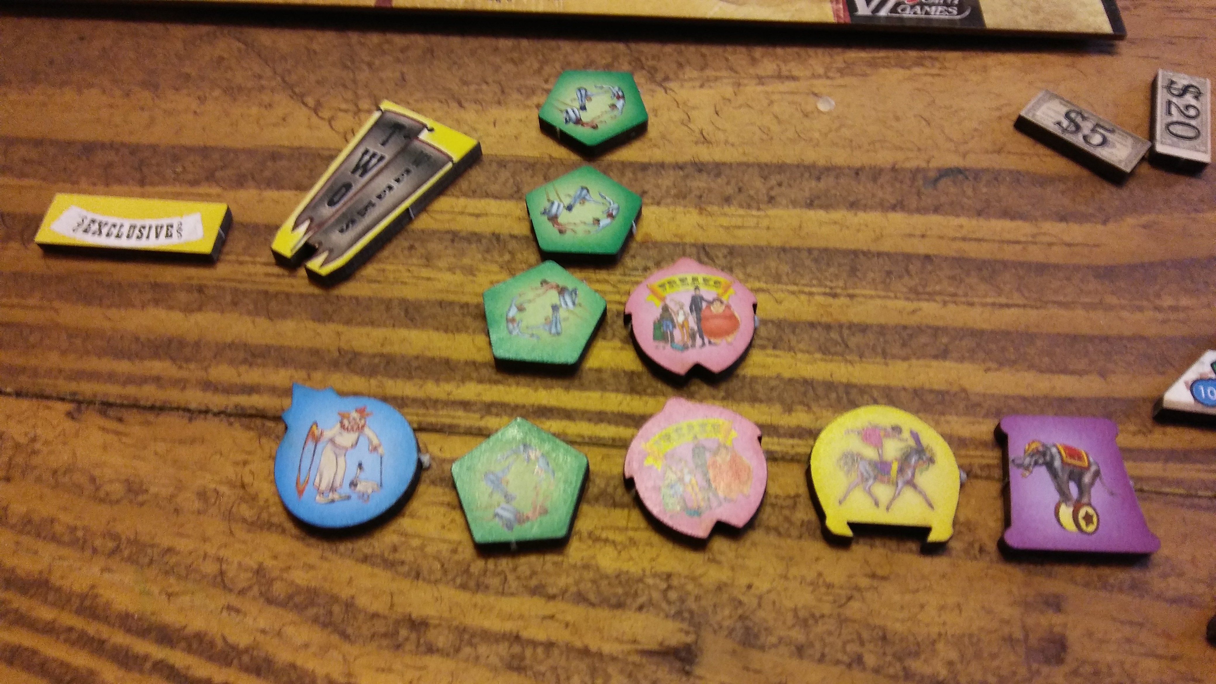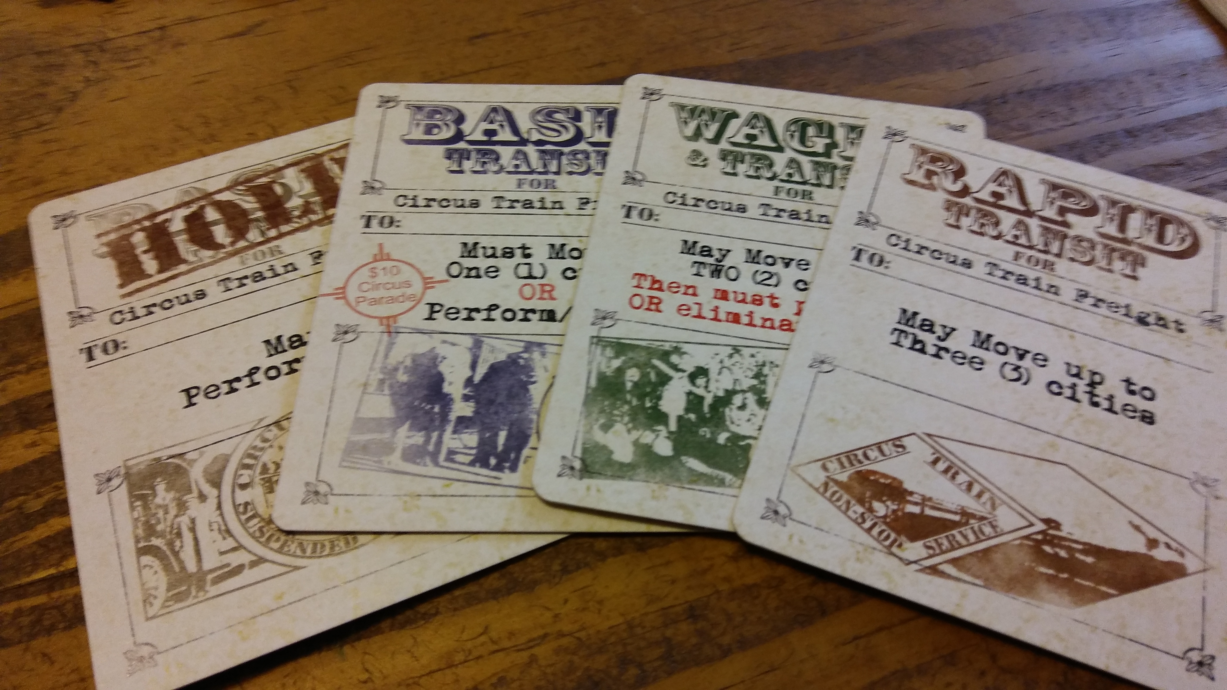 I absolutely love the components in this game! They are very thematic and done extremely well. The circus tents are fantastic! Everything fits nicely with the standees being just tight enough to stay on but not too tight that they don’t fit. The art and tokens are great. It all really ties the theme together. The event cards are great! My favorite component is the money!! For all those games that like paper money or think it is too expensive to make good token money…..take a look at the money in Circus Train. Simple, easy and quick to use! Money doesn’t need to be big and flashy and metal….it just needs to be serviceable, easy to manage and sturdy! The components are great!