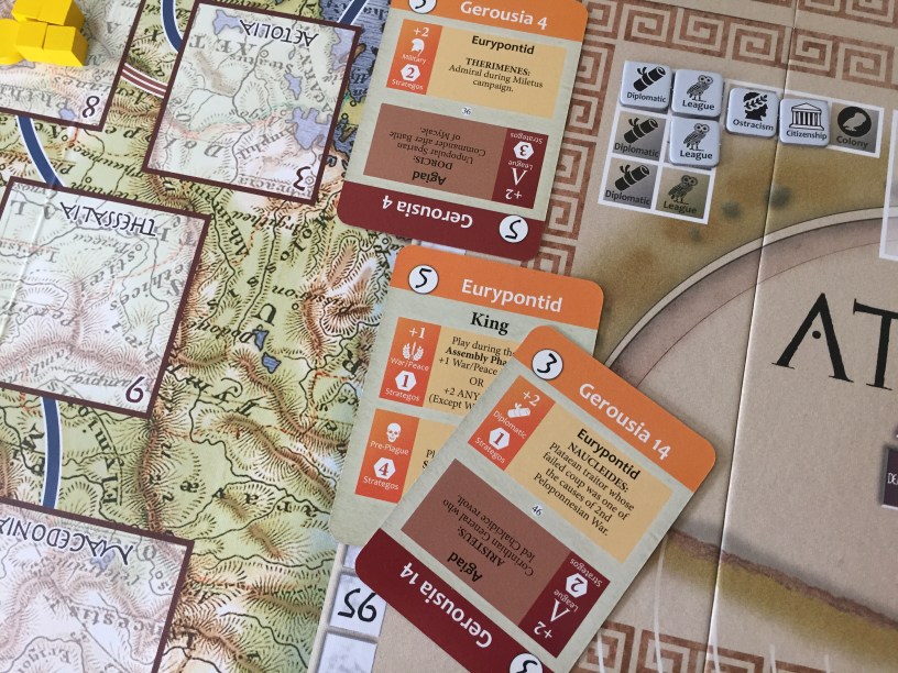 In Pericles, players control one of several factions amongst the Athenians and the Spartans. In a 2-player game, each player controls one faction from both the Athenians (either the Aristicrats or Demogauge) and the Spartans (either the Agiad or Eurypontid).  In our game I was the Aristocrats and Eurypontid.
