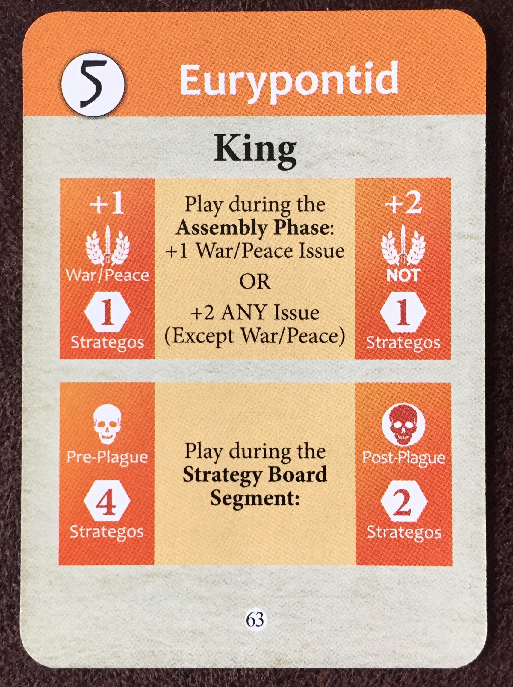 In our game during the Assembly phase, I wanted very badly to win the League Issue in the Spartan Assembly as I had designs to build some bases to establish my influence. When it was time to debate the League issue I decided to play my King Eurypontid card, which with its special ability would give me a total of a 7 (card value was a 5 with a +2 bonus on any issue if not War/Peace).