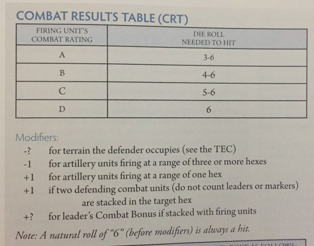 The Combat Results Table (CRT) is very straightforward and A units are the best, hitting on a modified die roll of 3-6, while D units fire last and hit on a modified 6. We found it very important to make sure stacks had a good mix of counters but it is vitally important to have at least some A units.