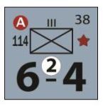 Kim: Dots and stars and coloured headers are just ways to show which units that belong to the same division. The two main numbers are strength and movement. A movement value that is red represents that it is motorized. The colour behind the units symbols shows you if they are normal units or whether they are support units or light troops. In the upper left corner is either a letter that indicates where on the map it is set up, or a number that indicates which game turn it will arrive. The most important number is the small one between the two main numbers. That is the quality number of the unit.