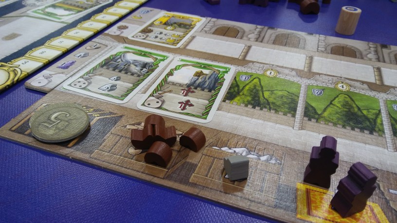 I liked the worker placement aspect of it, where each of your workers are associated with a die and you place those workers in a spot that has that number or lower. I like how every one has the same number for their workers, it’s what you can do and when you do it compared to the others that makes the difference. I also like that you are not just stuck with the number but you can raise that number with assistance if you want to.