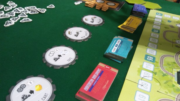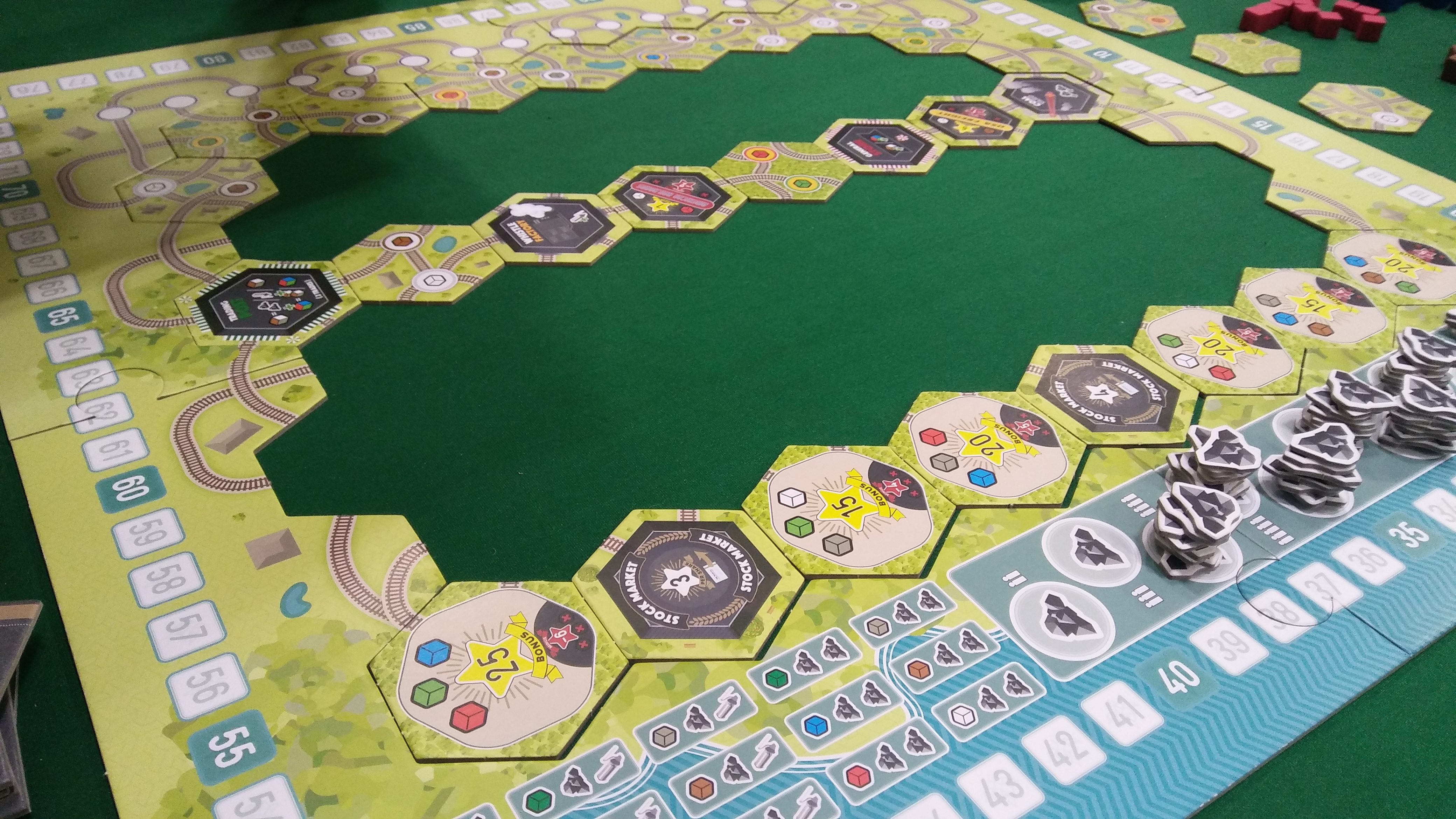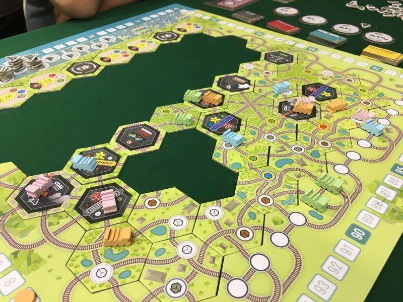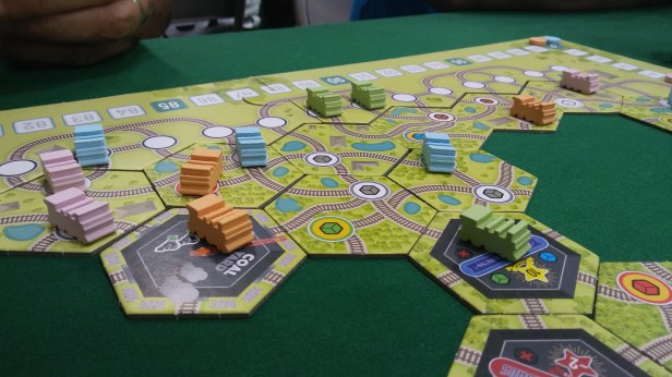 Challenging! There is a lot going on in this game. How many actions you want to take each turn, or want to hold onto for the next round, is a huge part of the strategy. Making sure you aren’t blocked by other trains for turns in a row. Making sure your trains are lined up to acquire the resources you need. Making sure you have the resources you need in order to buy the company stock that you want. Deciding what tiles to play and when. There are just tons of choices and paths to figure out.