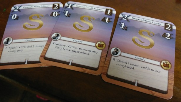 - My favorite mechanism in this game is the unit cards and how the battle system works. Each card will have values for attack and defense. Each attack and defense will have two values, one for close quarters and one for ranged. You can imagine that sword units will have good close quarters attack but weak ranged in both attack and defense. Each area of the battle field can hold up to 3 cards on each side. When you play a card to an area that already has a unit, you cover up the ability and the ranged attack and defense value of the existing unit. When you attack, you add up all the values in each section of the battlefield. So if the left side has 3 cards in it, the first card, closest to the battlefield and the second card will add their close quarters value while the last card, on top, you will add the ranged value. Same for the defense side. I absolutely love this mechanism. There is so much strategy that is involved with this. The decisions that need to be made not only during the battle but before the battle even begins are critical. You don’t want to have all up front guys with no ranged, or vice verse. It is a really intelligent battle design that I would love to see in larger games!