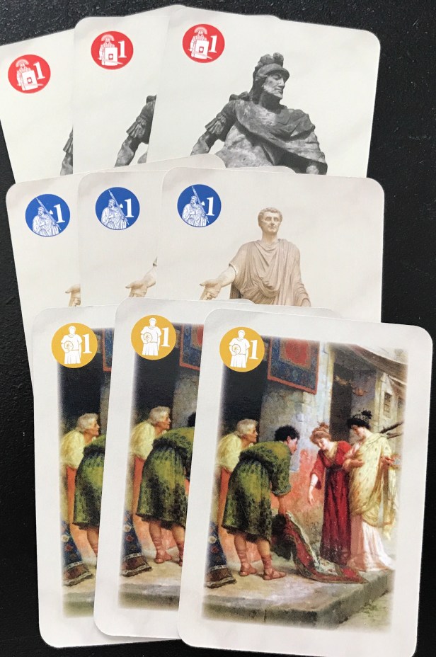 Each player starts with a deck consisting of three different types of cards, either red military, blue Senate or yellow populous cards. These cards are all 1 value and provide the players with points to spend on specific actions such as recruiting legions, moving armies, placing Governors, building improvements or increasing support. As you might imagine, 1 valued cards are not very powerful as they only give 1 Point.