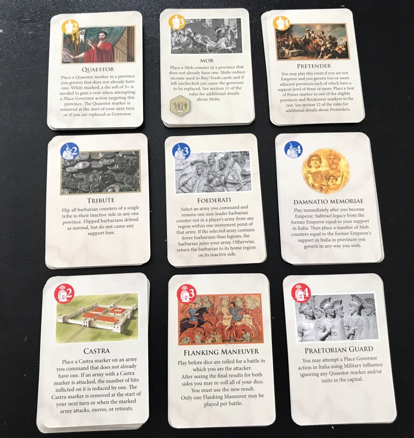 Players can select to purchase new cards from the above pictured 9 cards increasing from 2-4 influence in the same three colors. As you can also see, each of these improved cards contain written text that can be used in addition to creating influence. Some of this written text allows for rerolls in battles (Flanking Maneuver), the placement of a Quaestor marker that makes replacing Governors more difficult (Quaestor) and flipping barbarians to their inactive side (Tribute).