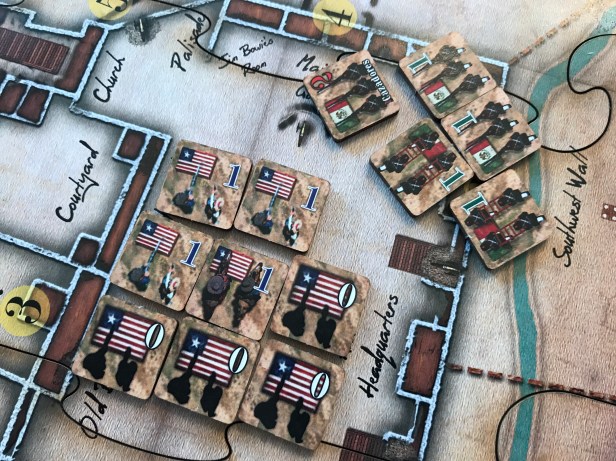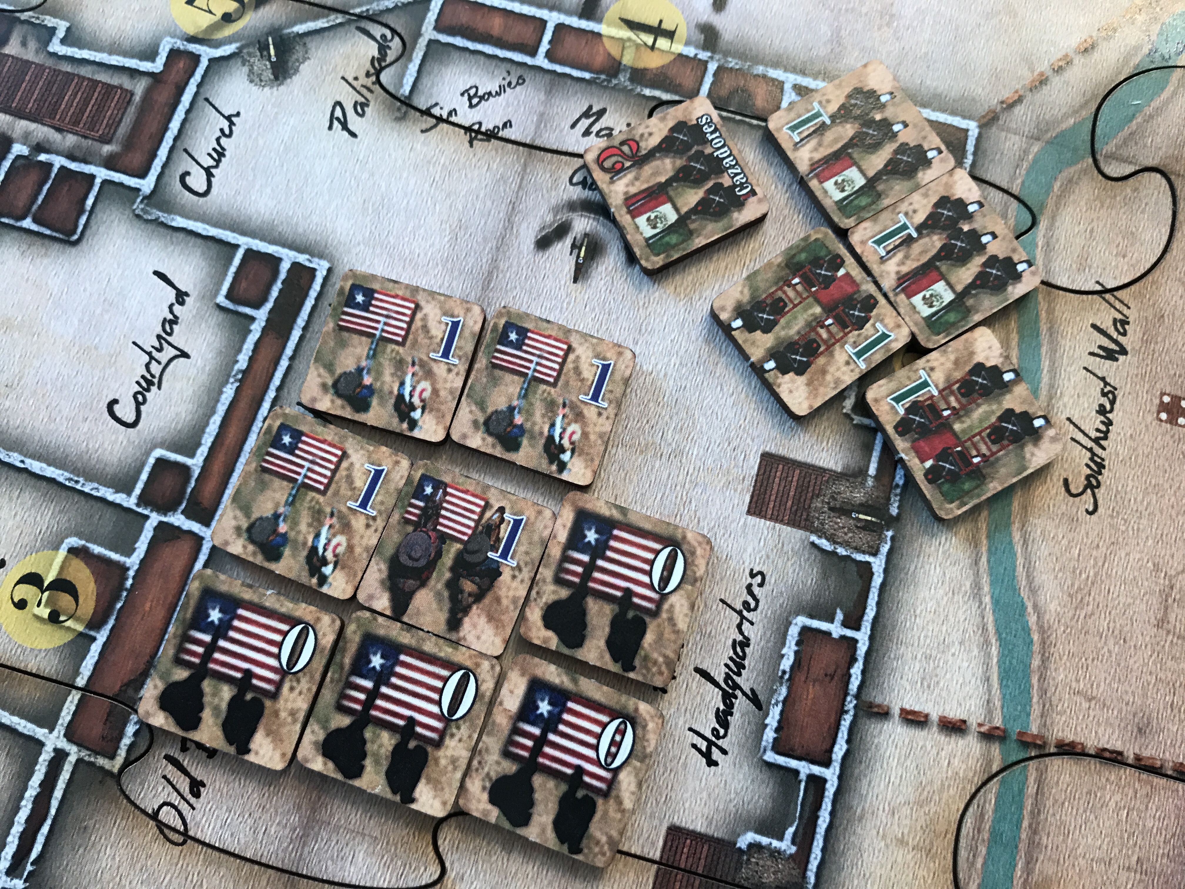 The Mexican player has to breach the walls in 3 turns…and it really isn’t that easy to do. The design uses a diceless combat system that is all about having higher combat strength than the enemy at the right place, which I really like as it keeps the game simple and eliminates the need for crunchy CRTs and odds calculations common in heavier wargames. The sooner the walls are breached the better for the Mexicans as they have stronger forces to overwhelm the defenders. The longer it takes to breach, the greater chance the Mexicans will end with a less emphatic victory scoring fewer VPs, which is considered a victory for the Texians.