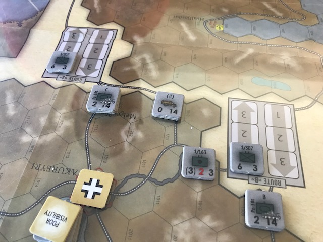 The enemy can set up an Opposed Exit from the boxes by simply moving their units in position to stop the transiting units. If this is the case, the transiting units have the option of simply entering the map via any legal hex within five hexes of the nominal entry hex. If this is impossible due to other units occupying these hexes, or from violating stacking rules, a combat can ensure at the exit point. This combat will not count toward the 3 round exit rule and your opponent will not be awarded the 6 VP. This can be a very savvy move by the side that is not using the Boxes as they can set up a pretty stiff defense that will be difficult to overcome with only one single unit. This could really cause some back log in the Off-Map Road Boxes and allow the other side to set up their defenses, sabotage ports and airfields or capture and reinforce various Victory Point awarding ports.