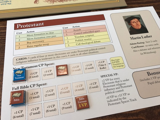 Once the Protestant player completes the translation of the New Testament, they can now focus on the full Bible in that language and can spend their CP to translate it. It is a little more difficult, as it requires 10 CP to be spent to get to the end of that track, but there is an amazing benefit awaiting for its successful completion. The Protestant player will now earn again 6 Reformation attempts in that language zone but this time they will gain a +1 modifier to each dice roll. Really powerful! The other added benefit to the Protestant player is that they will gain 1VP for completing each of the three language translations, but they can only be done once each per game. Simple, thematic and a different way for the Protestant player to go about the work of the Reformation.
