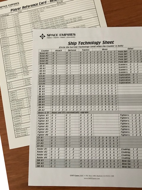 One unique aspect of Space Empires is that you have to do some book keeping with pencil (preferably equipped with a good eraser) and a double sided form that is provided with the game. Most 4X games use a player board with fancy cardboard tiles or wooden cubes to track technology advancements. On one side of the form is the Space Empires Production Sheet where you will track your economy and its growth and maintenance costs for each Economic Phase. At the bottom of this sheet is found the Technology Progression, or as I like to call it, the “Technology Tree”. Here are listed the various available technologies and your empire’s At Start Value for each. Then there is a box to the immediate right that has the New Technology Level with the various stages that can be purchased for a number of CPs listed.