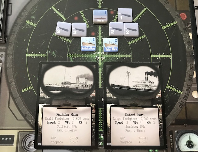When the Drum identifies the two ships, it draws the following cards with a specific named ship on it. In this instance, the nearest ship is identified as the Katori Maru, a huge 9,900 ton Large Freighter and the furthest ship is the Keihuku Maru a 3,600 ton Small Freighter. The Katori is worth 4VP if sunk while the Keihuku is only worth 2VP.