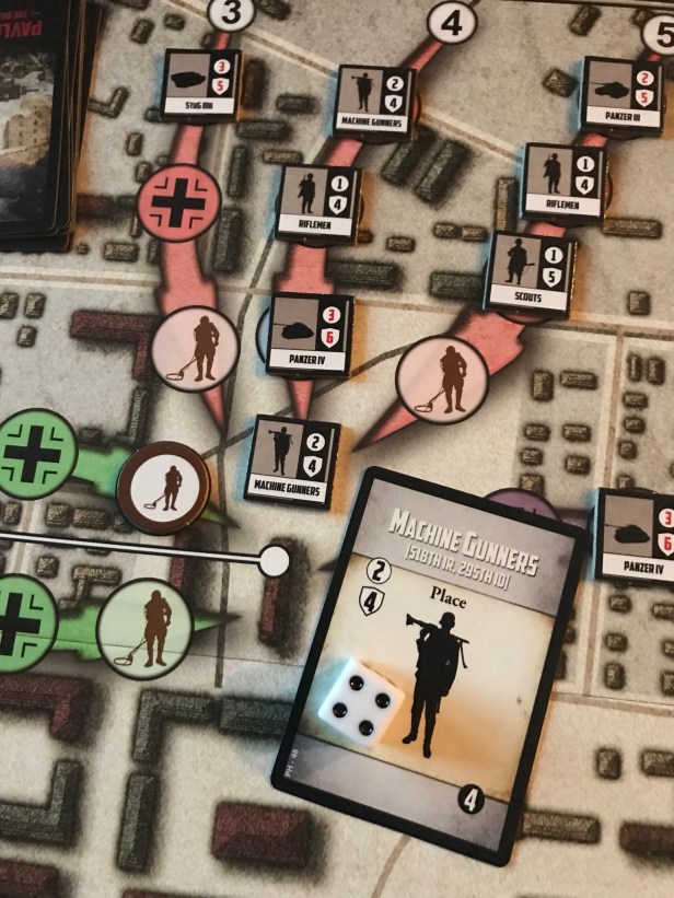 In the picture below, you will see that I was having trouble with the Red 4 track and when a German Machine Gunners card was drawn, the only way I could lose at that point was if I rolled a 4!