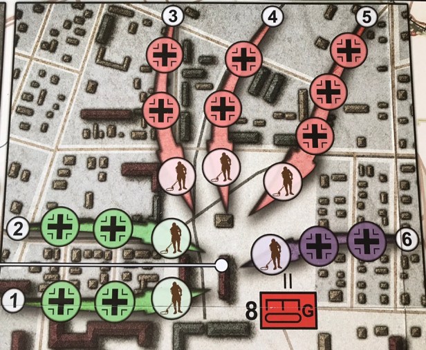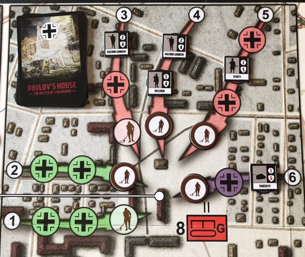 This area of the board represents the tactical level actions that are taken by elements of the German 6th Army that assaulted Pavlov’s House.