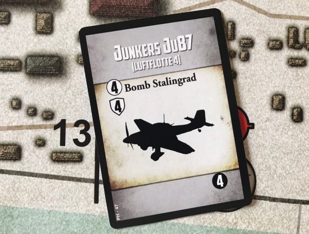Bomb Stalingrad – Now to my favorite one. I say favorite because you can spend your Soviet Cards in the previous round to build up a Defense to these cards. When you draw a Junkers Ju 87 Card, the Germans are attempting to bomb your assets on the Volga River operational-level map to take out your river flotilla supply chain, disrupt communications, and attempt to destroy the 62nd Army Command Post.