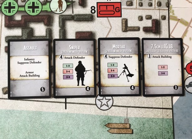 The final card type is the Assault. This card is very bad as it gives each Infantry unit and Armor unit an Attack on the building and its defenders. Each Infantry unit facing each of the three building sides will total their dice and roll to Suppress. They will have to overcome the Defense Value of the building to effect the defenders by placing a Disrupted Token but it can be devastating as each unit on Each side will get a shot. The Armor also will Attack the building and hit if their rolls are equal to or greater than the Defense Value. The way to deal with this card is to keep the number of counters on the tracks to a minimum. Easier said than done sometimes though!