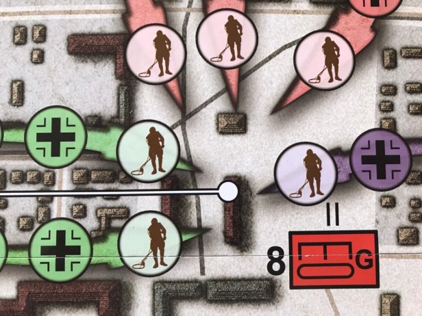 My final point in this post is the last line of defense: the Sappers! You will notice at the end of each track is a figure of a soldier with what appears to be a mine sweeper. If you have been able to ferry Sapper tokens across the Volga and then use your 8th Sapper Battalion Soviet Cards to place a Sapper Token in one of these spaces. If a Wehrmacht Counter is forced to enter this space the Soviet Defender will get to roll 3 dice to see if they destroy the counter. All they must do is roll equal to or greater than the counter’s Defense Value and it will be removed. This is a one time last ditch effort however as it will be removed once triggered and if it misses you will suffer an auto loss!