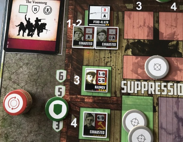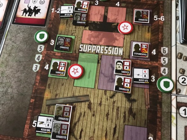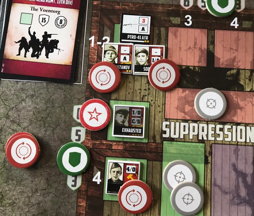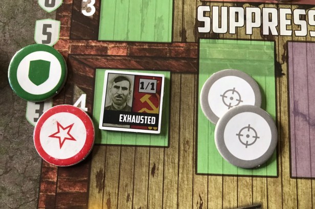 The Suppress Action is one of the more important Actions in the game as it is a very reliable method of eliminating Wehrmacht Unit Counters by stopping them from coming onto the board in one of the assault lanes. Each Soviet Counter has a Suppress Value (ranging from 0-6) and can take this Action to move a certain number of Suppression Tokens from the Supply to the Suppression Boxes for each of the various assault track colors.