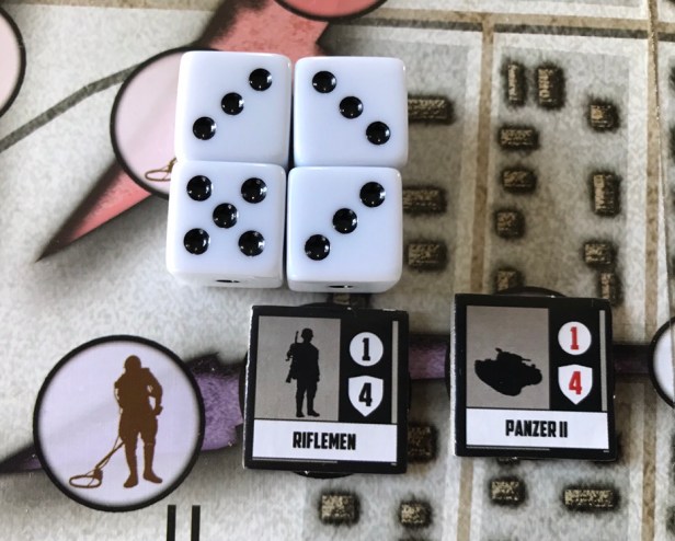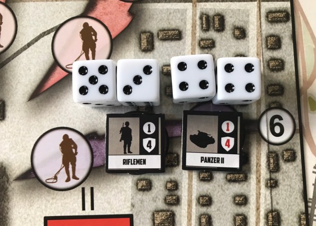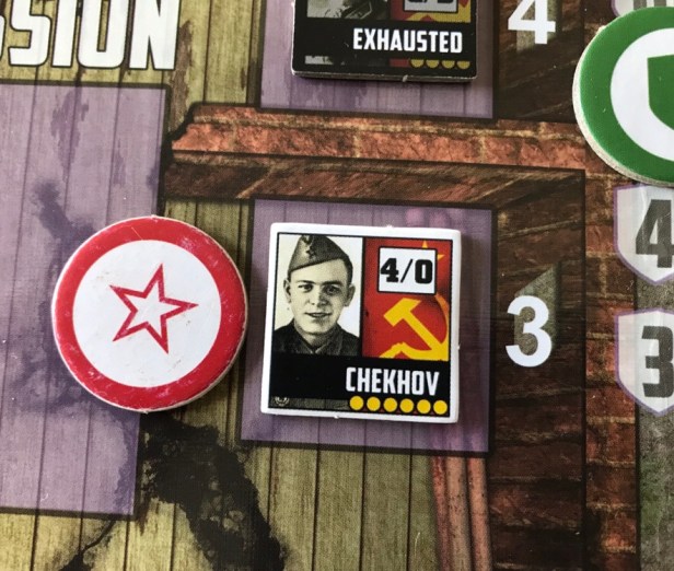 Chekhov rolls a 3, 3, 3, and 4. The 3’s are misses but the 4 equals the Defense Value and the Riflemen counter will now be removed from the board as a casualty. This will now exhaust Chekhov who will be flipped to his grayed our side and will need to be Recovered in a future turn in order to take another action.