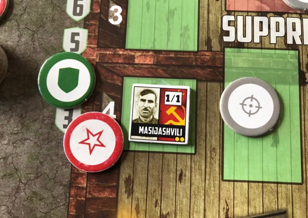 In the above picture, you will notice that the Masijashvili Counter has a Suppression Value of 1. When this unit takes the Suppress Action, he will exhaust and move 1 Suppression Token from the Supply to the green Suppression Box. This token is then available to be used at any time to Suppress a Wehrmacht unit Counter from coming on the board when drawn during the Wehrmacht Card Phase. When the token is used to attempt to Suppress a unit, it doesn’t require an Action to be used.