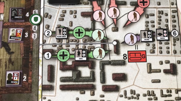 In the upper right corner of each counter is listed that unit’s Attack Value and its Suppress Value listed like so 1/1 or 4/0. When a unit wants to take the Attack Action, first it must have line of sight to its target. This simply means that the counter is located in a Combat Position that is the same color as the target counter. If these colors match, and some of the Combat Positions have two colors, it can then exhaust and roll the number of dice equal to its Attack Value to attempt to kill the target unit. You must remember though that Infantry units can only be attacked by counters that can Attack infantry units. This roll is then compared to the Defense Value of the Wehrmacht Infantry Counter. In the picture below, you will see that Chekhov, who is located in a purple Combat Position, is Attacking the Riflemen Infantry Counter that is also located in a purple position. Chekhov has an Attack Value of 4 and will roll 4 dice trying to roll at least one 4 to overcome the Riflemen unit’s Defense Value of 4.