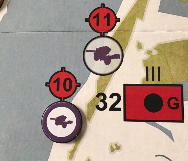 In the picture above, you can see the Soviet Counter that has the Forward Observer special action designation has line of sight to the two Wehrmacht counters (a Riflemen and a Panzer II) that are adjacent. They simply must then discard an available artillery token from the 32nd Guards Artillery Regiment location on the Volga River operational-level part of the board and then roll two dice for each unit.