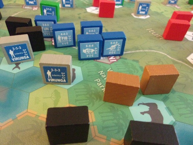 This wargame on the ongoing confrontation in the African Congo presents the players with the challenge of controlling multiple factions including the UN forces, (MONUSCO), the Force Intervention Brigade, the FARDC, the FARDC Republican Guard, the Virunga Park Rangers, the specially trained Mine Police, the Congolese National Police, the M23, the FDLR, the FRPI, the ADF, the M23, the SPLA-IO, and the MaiMai. Attack and transport helicopters, drones, armor units, and artillery all have a role in deciding the battle.
