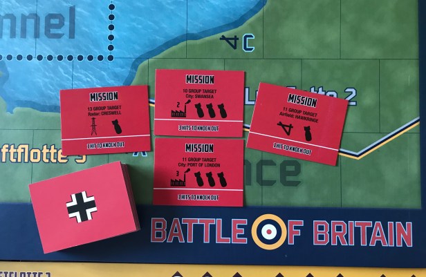 During Turn 1, none of the Luftwaffe flight’s will have a mission assigned yet. The process starts with the Luftwaffe player shuffling the deck of 50 Mission Cards. Mission Cards simply identify targets that the Luftwaffe has been ordered to bomb. These targets include specific named cities, a specific airfield or radar stations. These targets will be identified by the Group Area the mission is located in on the map and the number of successful bomb hits needed for each target to be destroyed.