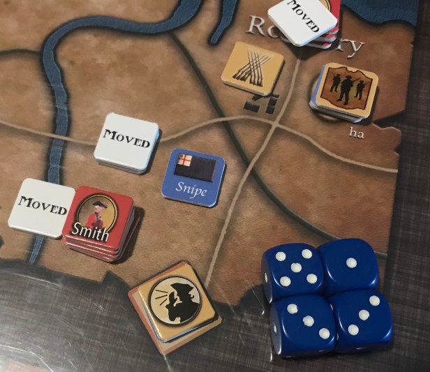 In the above picture showing a Snipe action, I as the Patriot player performed miserably and didn’t roll a single six with 4 dice. A pitiful example of a proper Snipe action.