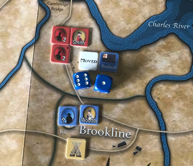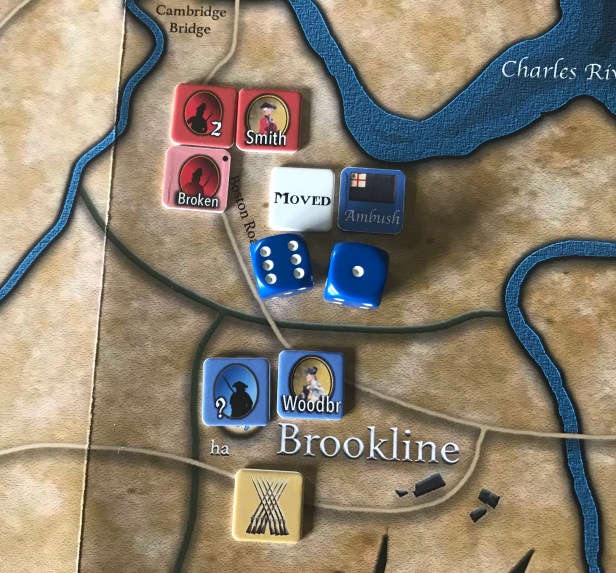 In the picture above, you can see that as the Patriot player I rolled a 6 (hit) and 1 (miss) on this Ambush attempt which will lead to one unit becoming broken.
