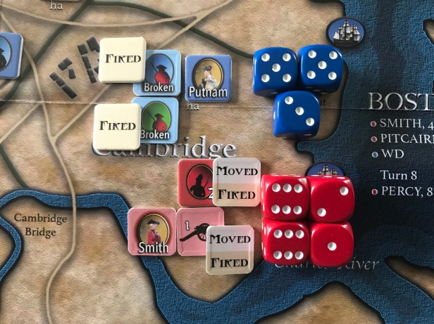 With Simultaneous Combat, each player totals the strength points of their units participating and rolls that number of dice. Hits are totaled and each player will apply the hits scored against them. in the picture above you can see that the British player has four strength points while the Patriots only have three. The dice are rolled and the British hit on any roll of a 4-6 whole the Patriots will hit only on a roll of 5-6. In this battle, the British roll two hits with 6’s and the Patriots score two hits as well with 5’s. Any time the British Attack with the Field Cannon, they will automatically score an extra hit so in this case they will score three hits.