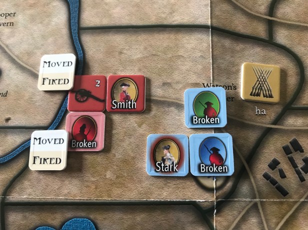 After the Charge is complete, the Patriots must retreat all units in the region that are broken. The Patriots may also optionally choose two leaders in the region to retreat as well. It’s never good to leave your leaders behind and unprotected. This forced retreat is really a good bonus as now it will make Searches easier in the region as there will be no reductions in uncovered hash marks from the presence of unbroken Patriot Militia or Minuteman.